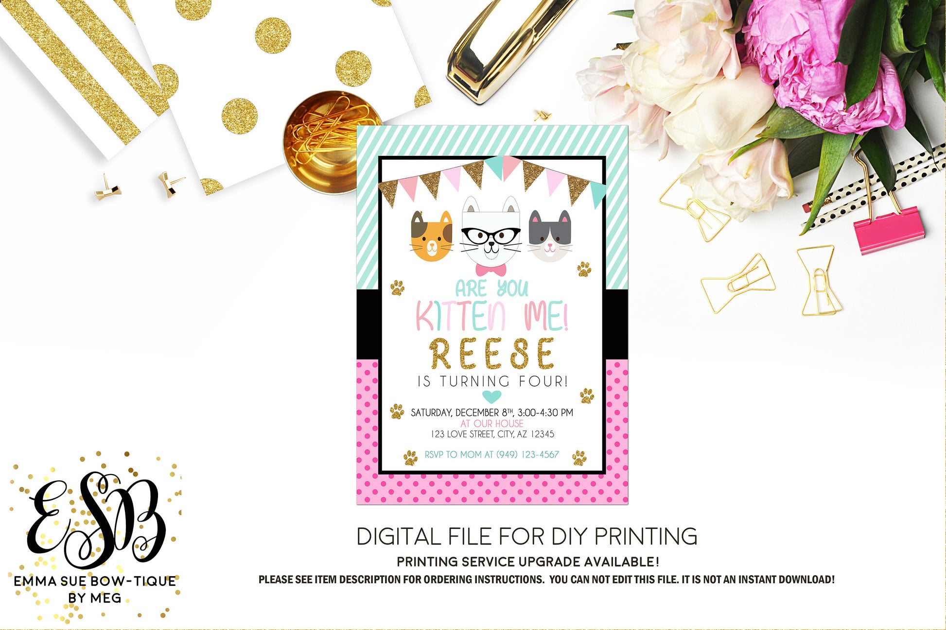 Are you Kitten Me - Girl's Kitten Birthday Party Invitation Printable - Digital File (kitten-pastelPolka)