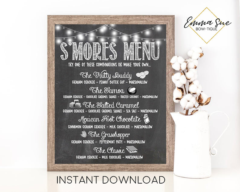 S'more Menu Chalkboard Design Printable Sign - Digital File - Instant Download
